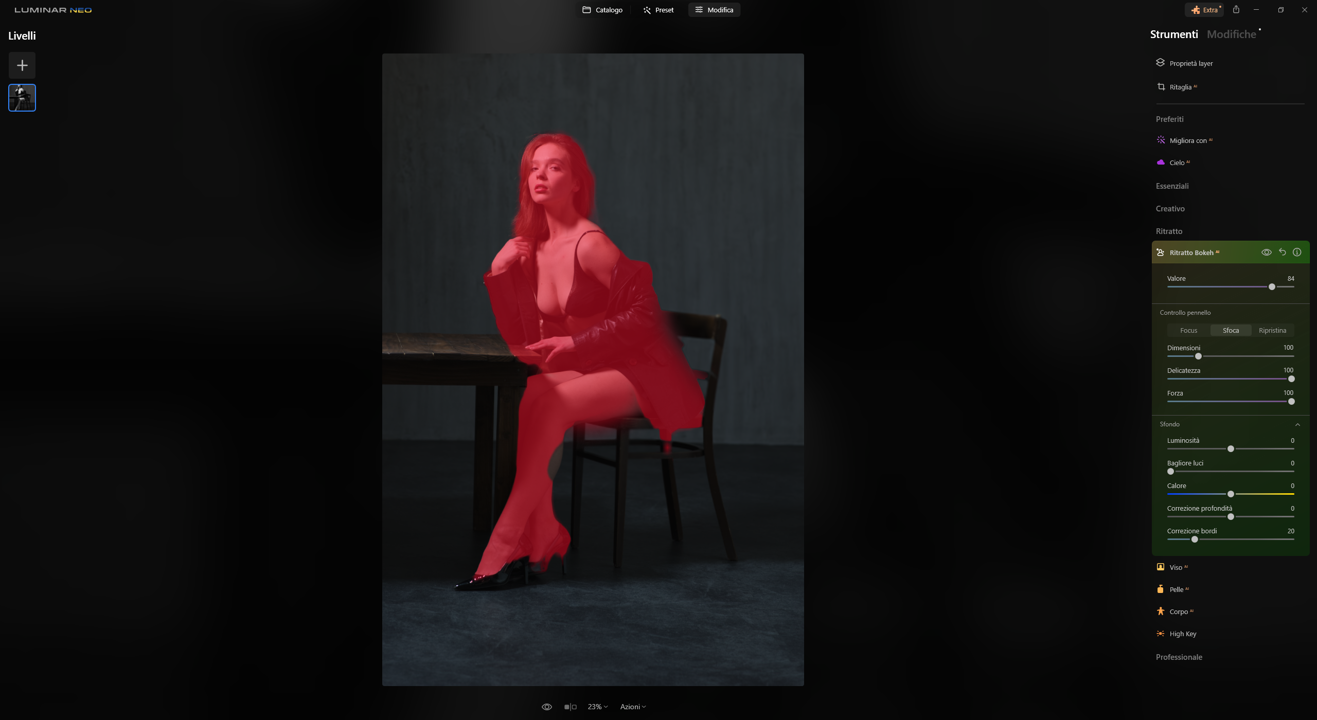 Ad esempio, nel caso del ritratto, è disponibile una omonima sezione di strumenti che include Ritratto Bokeh, Viso, Pelle, Corpo (tutti basati su AI) e High Key (strumento tradizionale).