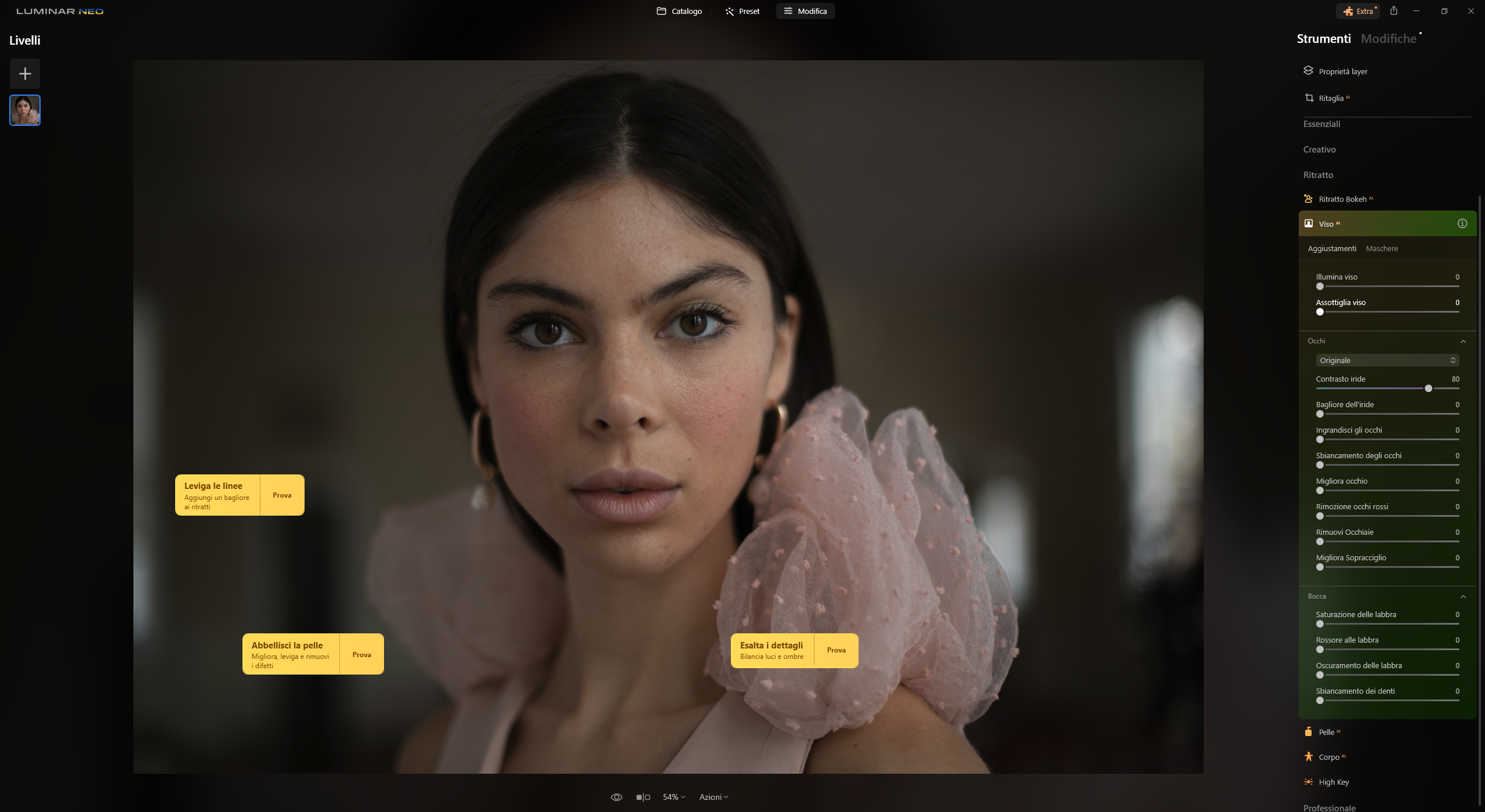 Più in generale, chi desidera avere un'idea più precisa delle potenzialità del programma, sappia per iniziare che tutti e soli gli strumenti utilizzati confluiscono in una seconda scheda nella stessa colonna di destra, chiamata Modifiche, che di per sé dona a Luminar Neo una certa flessibilità. Grazie ad essa è infatti possibile, in ogni momento, di avere un'anteprima prima/dopo di ogni singolo strumento utilizzato, comodamente raggruppato in uno spazio apposito.