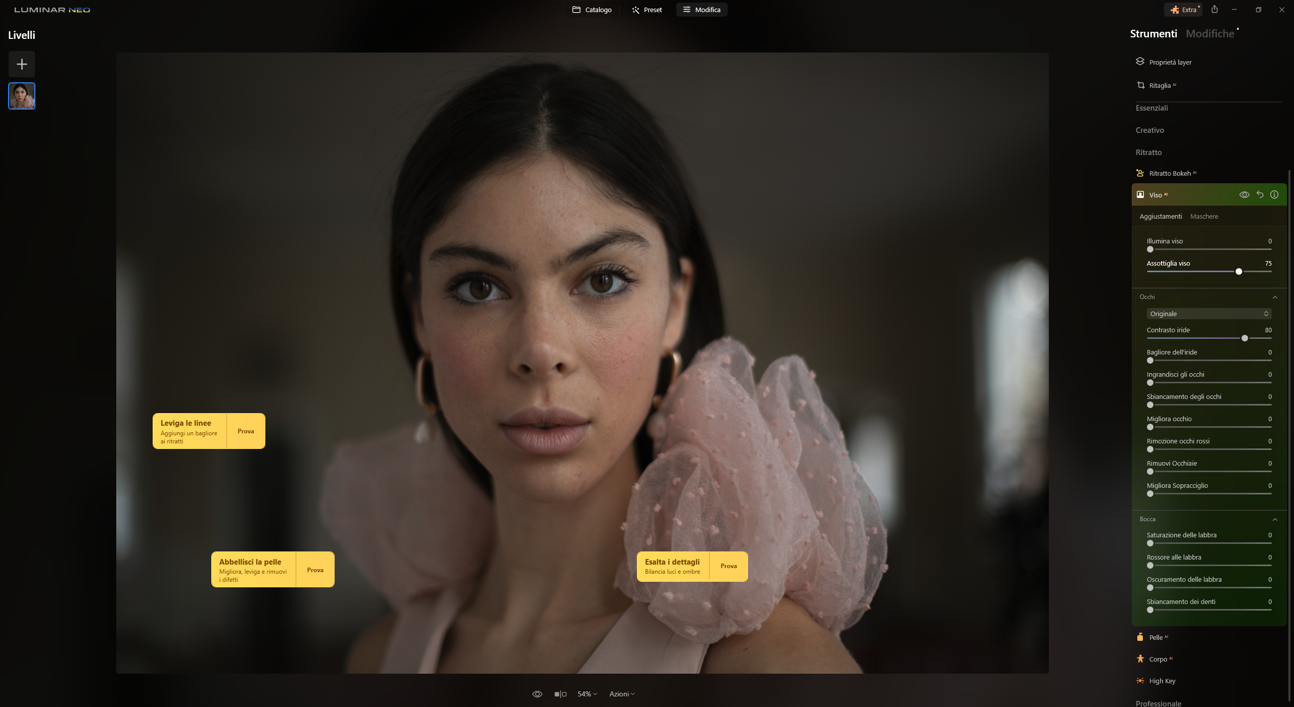 La sezione Viso è più particolare e sorprendente. Si parte con il "semplice" tool Illumina viso, ma già il secondo in lista è Assottiglia viso, che modifica la fisionomia del volto in modo credibile anche in caso di intensità dell'effetto decisamente marcata.