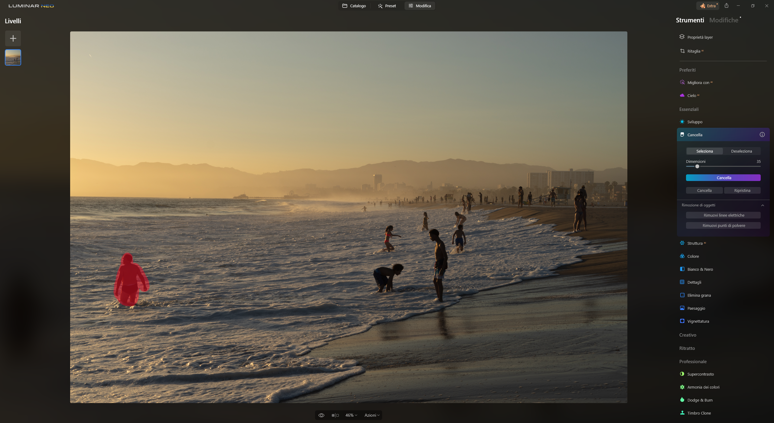 Chi desidera fare il passo successivo, può passare dall'area Preset all'area Modifica, dove molti strumenti basati su intelligenza artificiale consentono di fare modifiche anche estremamente complesse con una semplicità sconcertante. Le poche foto-tutorial fornite con il software guidano molto bene alla scoperta di questi strumenti.
