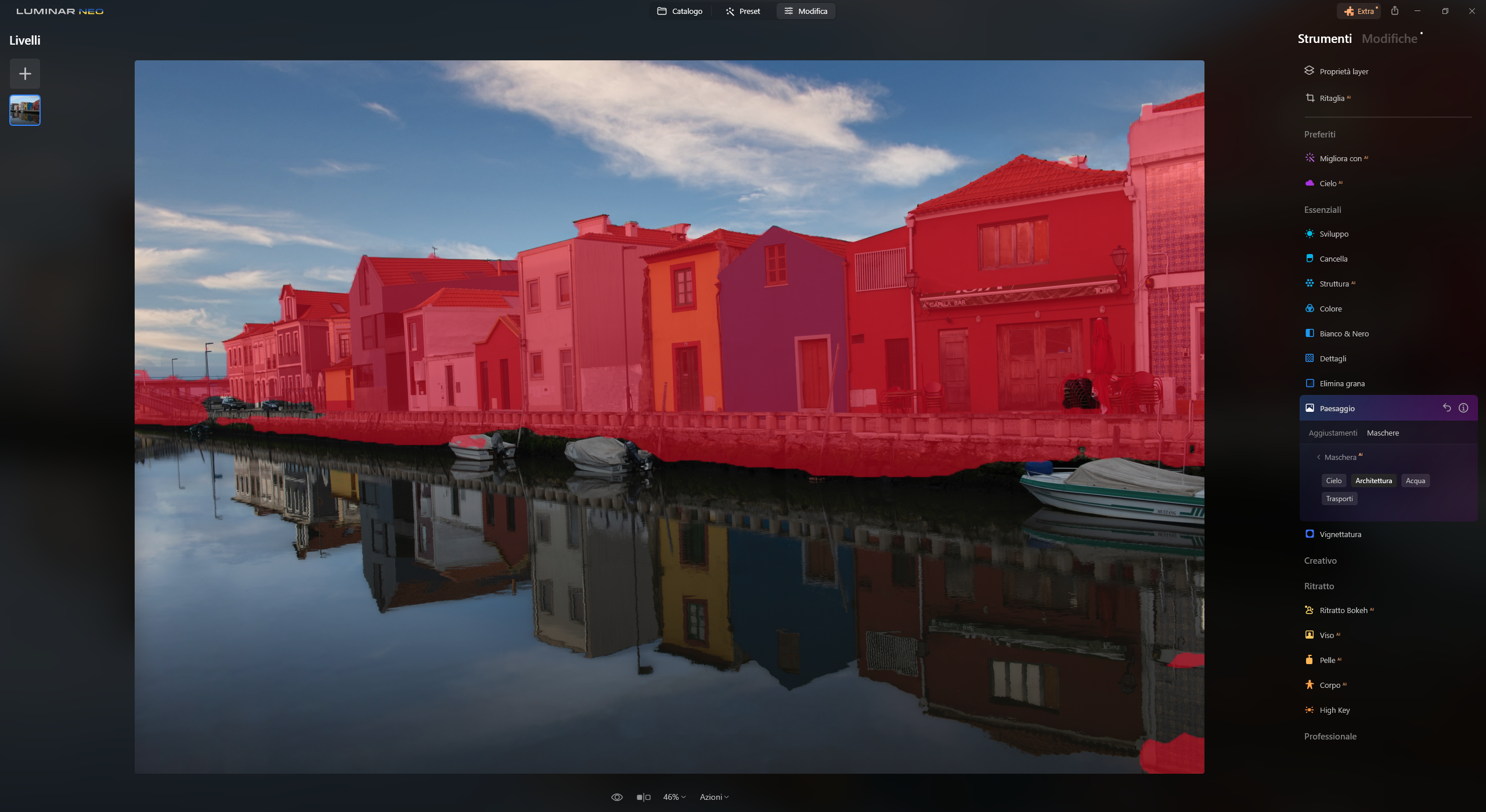 L'AI rileva a colpo sicuro elementi come persone, cielo, acqua, elementi architettonici, mezzi di trasporto e altro ancora eventualmente presenti all'interno della scena, e consente di selezionarli con un click. Il risultato può non essere perfetto, ma può sempre essere affinato manualmente con il Pennello e rappresenta in ogni caso un'ottima base di partenza e un enorme risparmio di tempo.