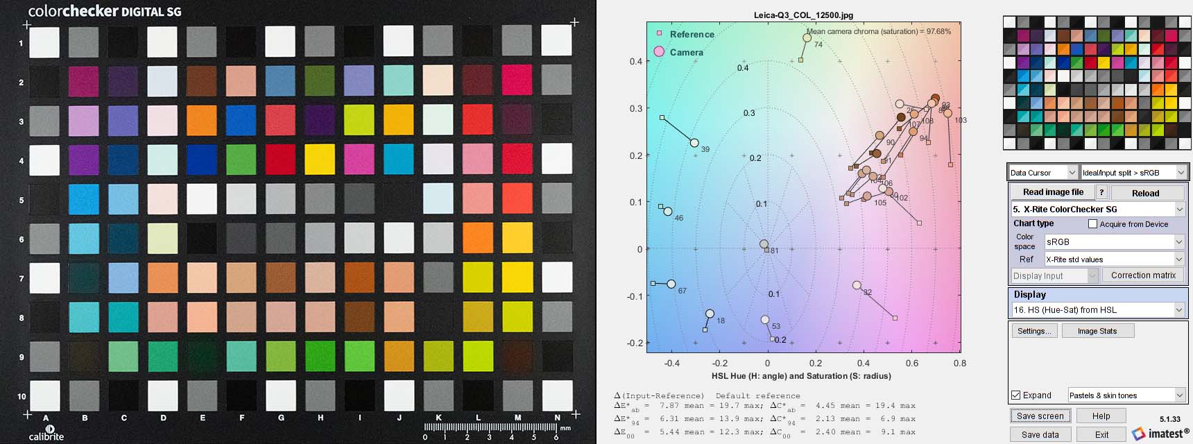 Ottima la risposta cromatica, con una saturazione nell’intorno del 100% praticamente costante tra 100 e 12.500 ISO compresi e un errore cromatico medio dC94 nell'intorno dei 2 punti, irrilevante nella pratica quotidiana. Leggera de-saturazione dei rossi e dei verdi, secondo una scelta stilistica già osservata con altre fotocamere Leica, che fa parte dello “stile” del marchio.