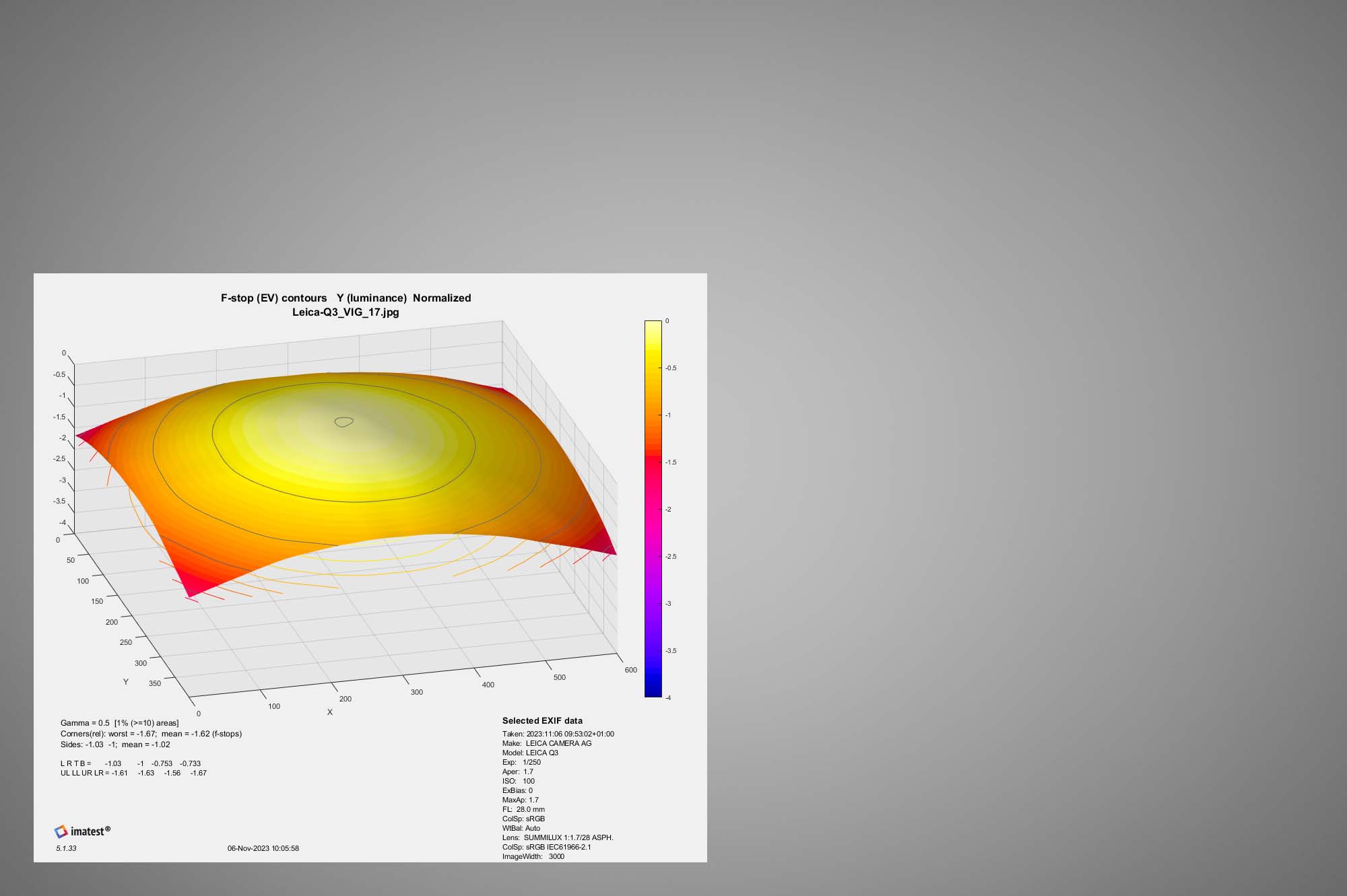 Il Summilux della Q3, alla sua massima apertura f/1.7, perde poco più di uno stop e mezzo negli angoli e circa uno stop ai lati.