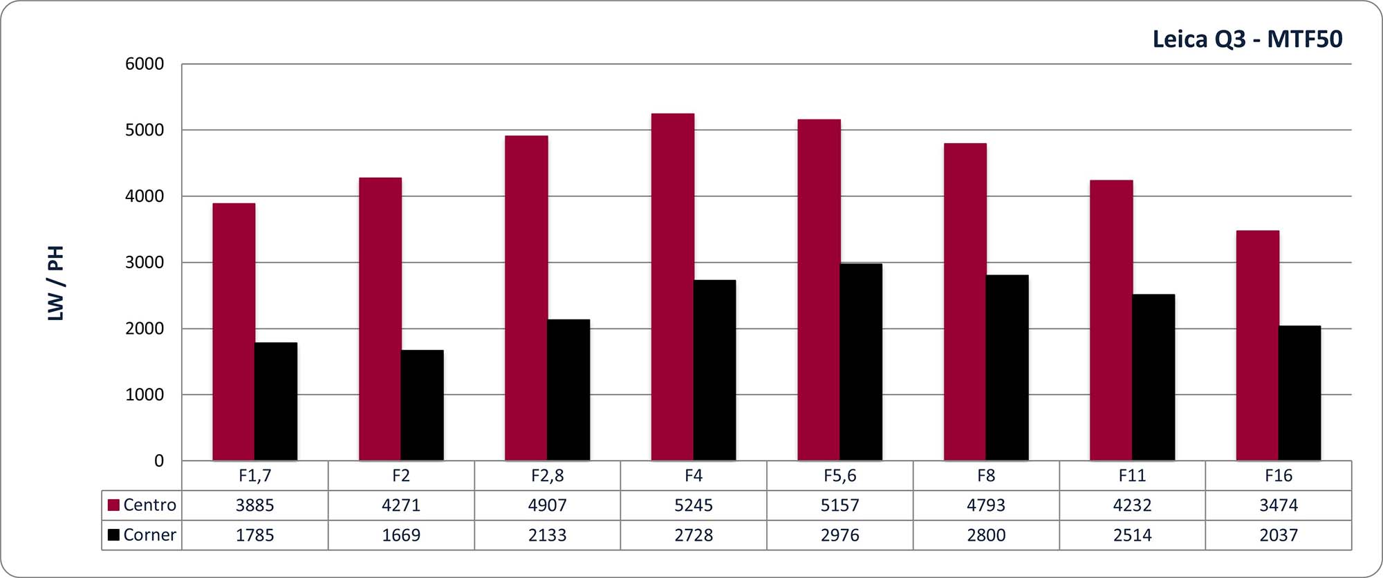 L’ottica è in generale molto nitida al centro a tutte le aperture di diaframma (vedi grafico), mentre ai bordi, come comandano le leggi della fisica, è necessario diaframmare un po’ per ottenere il massimo della nitidezza – almeno f/2.8, meglio f/4 che, per inciso, è anche il diaframma che restituisce il massimo punteggio MTF al centro, e si può quindi considerare l’apertura di lavoro ideale della Q3.