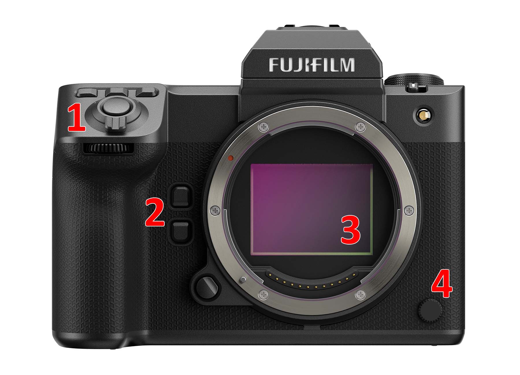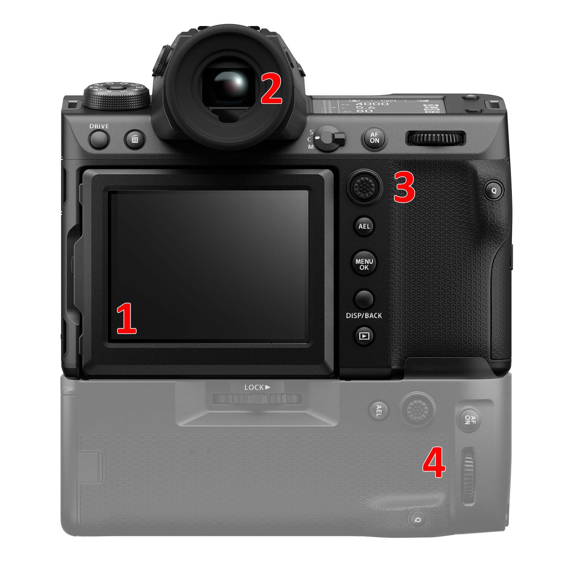 1 – Lo schermo posteriore, invariato rispetto alla GFX 100, misura 3,2 pollici e conta 2,36 milioni di punti. Può essere inclinato verso l'alto e verso il basso, oppure, previa pressione del pulsante laterale, verso destra, per favorire la ripresa del basso con orientamento verticale.