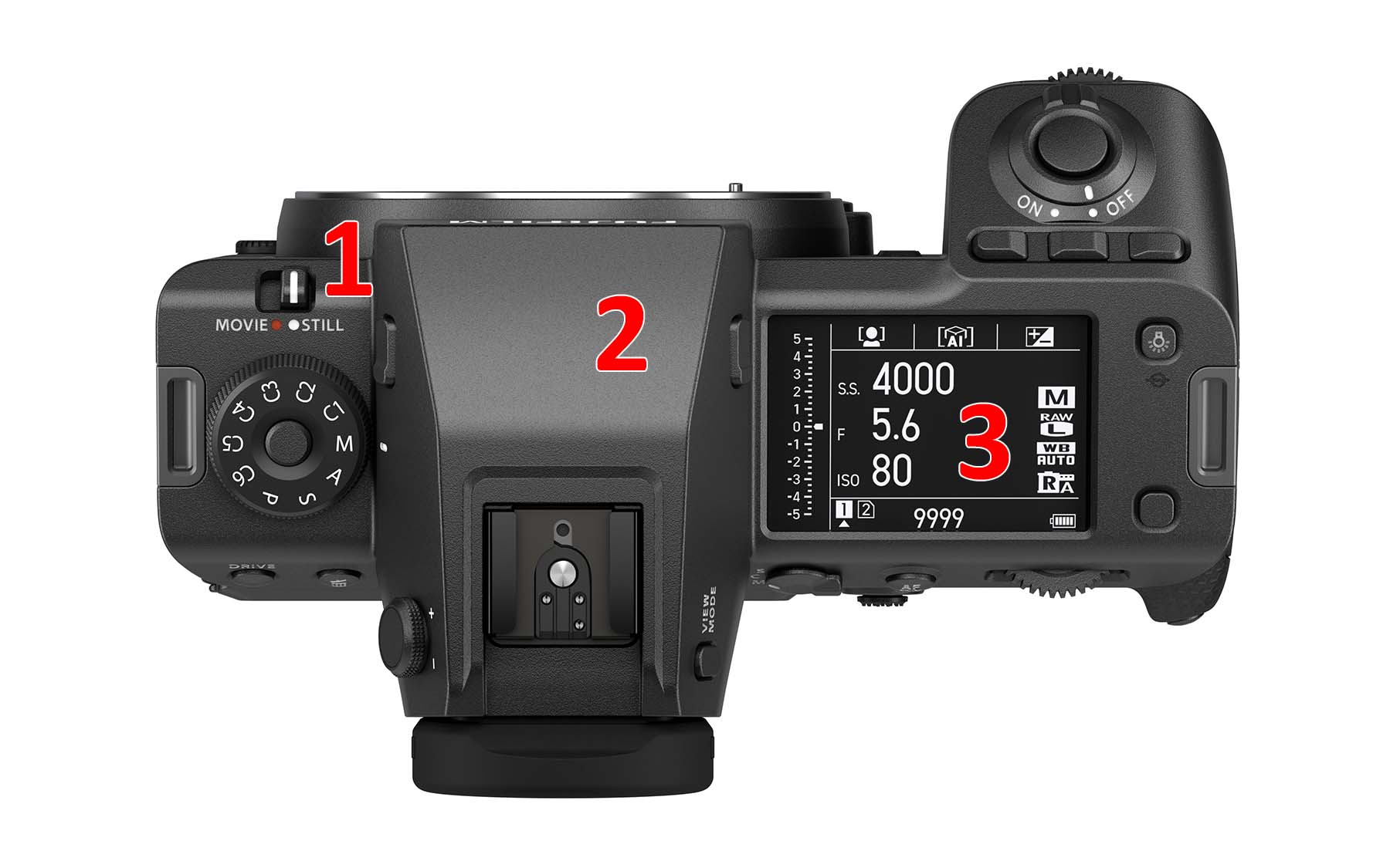 3 – Davvero enorme il display superiore, rivisto e ulteriormente ampliato rispetto alla prima generazione. Offre moltissime informazioni (leggibili anche a fotocamera spenta), due modalità di visualizzazione (fondo bianco o nero, con il primo che funge da retroilluminazione) e 4 schermate a scelta del fotografo: la rappresentazione "a doppia ghiera" già vista sulla GFX 100, l'istogramma, e due schermate informative come quella qui mostrata, separate per foto e video e ampiamente personalizzabili. Si passa dall’una all’altra premendo il pulsante a destra del display.