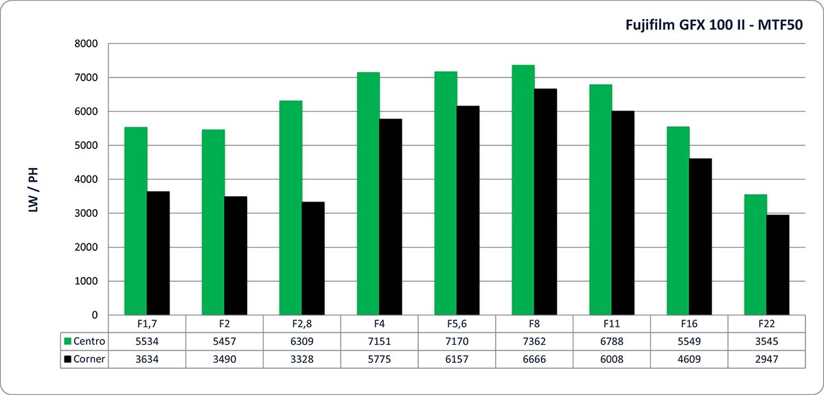 GFX 100 e 100S, provate, rispettivamente, con GF 110mm F2 e con 80mm F1.7, avevano fatto segnare entrambe sostanzialmente gli stessi punteggi, fermandosi a ridosso delle 7000 LW/PW. La GFX 100 II equipaggiata con il 55mm F1.7 arriva un poco oltre, sfondando quota 7000 LW/PH con ben tre diaframmi di lavoro (f/4, f/5,6 e f/8).