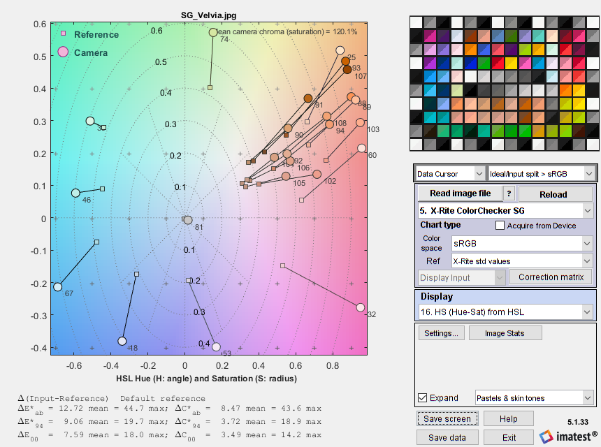 Nonostante i pochi scarti angolari, l'errore cromatico è ovviamente superiore a quello della PROVIA, proprio a causa della maggior saturazione dei colori. Nei toni pastello si nota ancora un leggero shift del ciano verso il blu, parte integrante del pacchetto "cielo fantastico" della VELVIA, mentre i toni dell'incarnato, anch'essi mediamente più saturi, non sono sostanzialmente diversi rispetto alla PROVIA. Attenzione però all'elevata saturazione del rosso-magenta (patch 32), che rende sconsigliabile l'utilizzo della VELVIA nella ritrattistica.