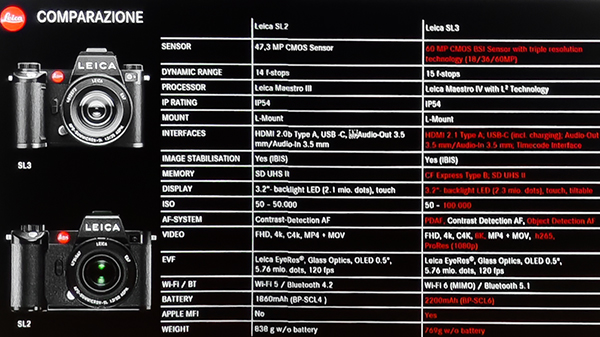 Nonostante il display basculante, la fotocamera ha subito una cura dimagrante e ora è 3mm più bassa e 5mm meno larga, con un peso inferiore di 80 grammi rispetto a SL2. Leica SL3 pesa infatti 770 grammi (senza batteria). I tecnici tedeschi hanno rivisto anche l'interfaccia, sia a livello hardware, sia a livello software.