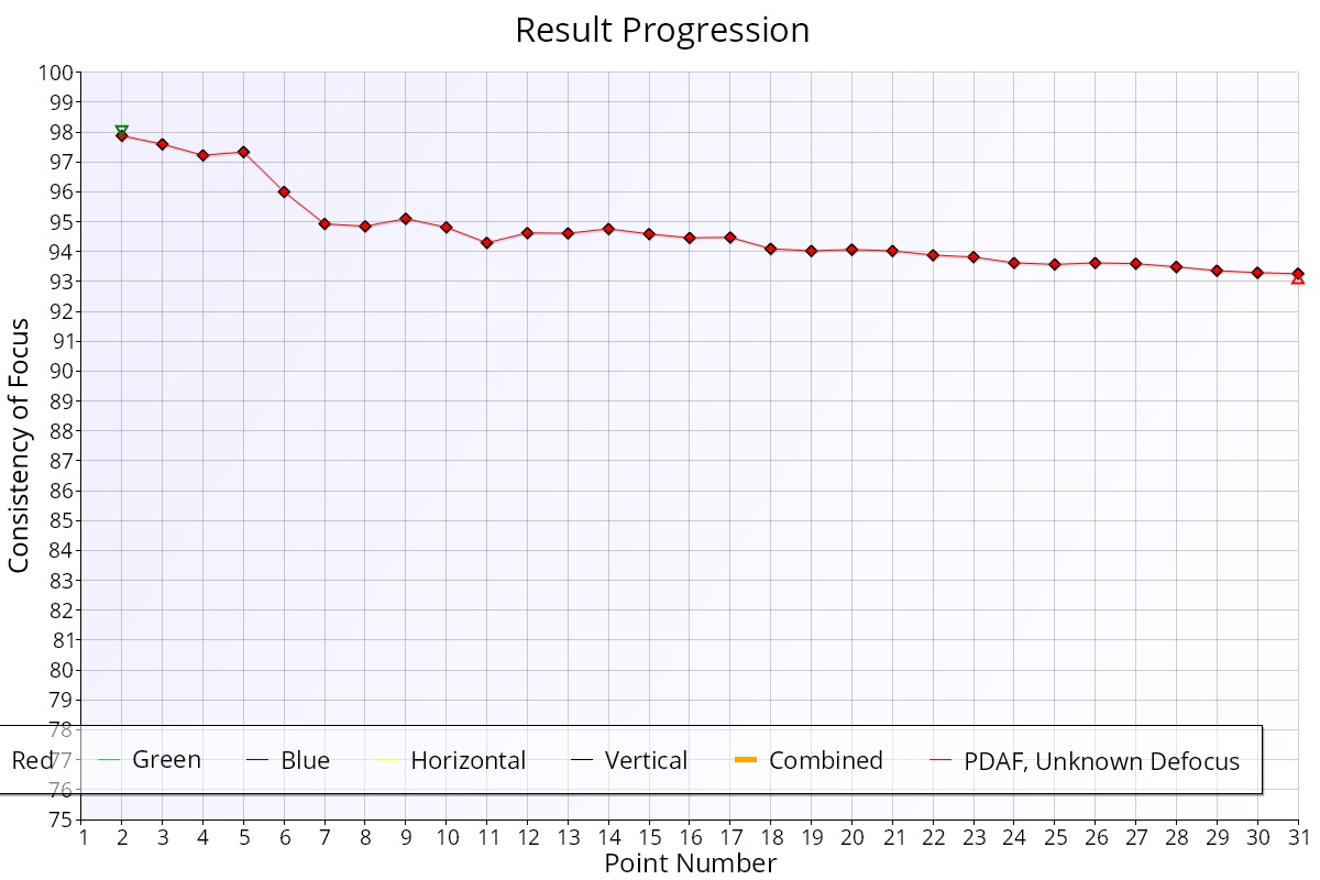 La messa a fuoco, attuata da un motore lineare, è silenziosa, precisa e caratterizzata da buona ripetibilità (vedi grafici). È anche piuttosto rapida se confrontata con quella di altre ottiche GF, grazie soprattutto al fatto che il motore lineare deve muovere un gruppo AF interno costituito dal lenti di piccolo diametro.