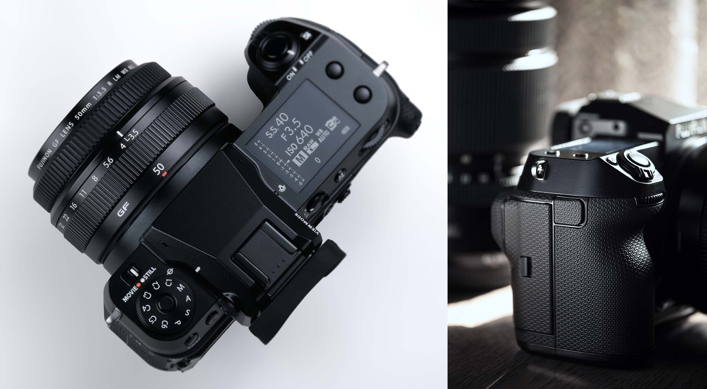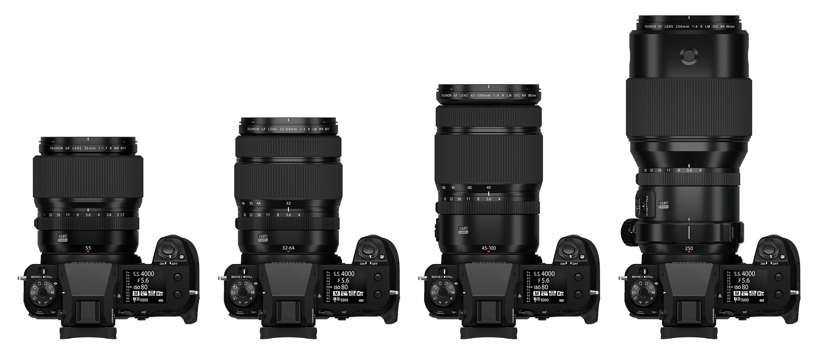 Rapporto tra corpo macchina e 4 noti obiettivi del sistema GFX, dal "normale" 55mm al tele 250mm.