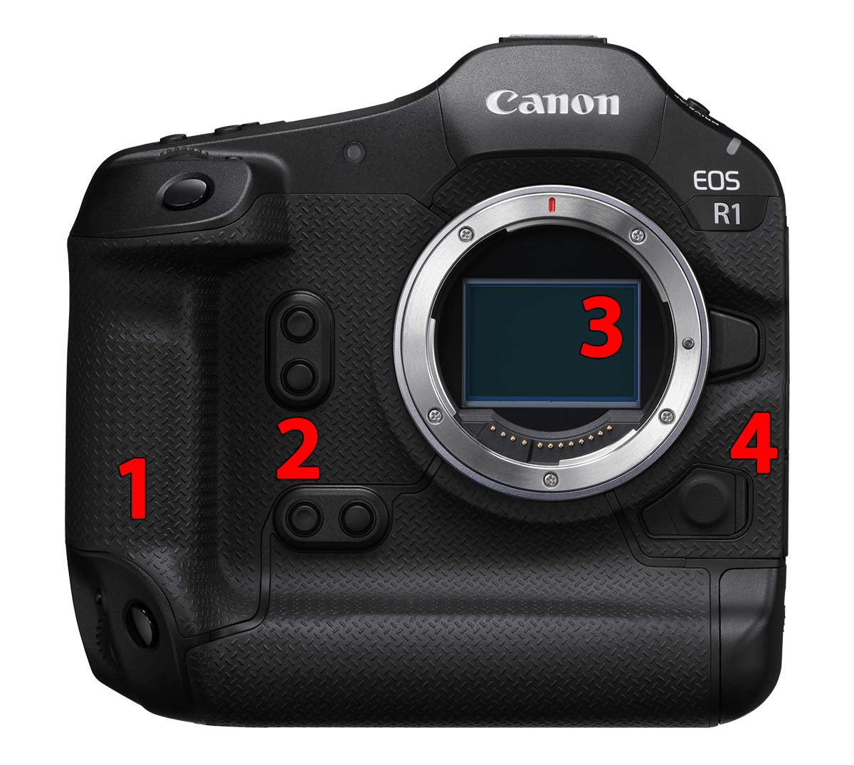 1 – L'impugnatura della R1 è, senza sorprese, del tutto analoga a quella delle reflex 1D-X, e della R3 prima di lei. Rivista la texture, immutato il comfort.