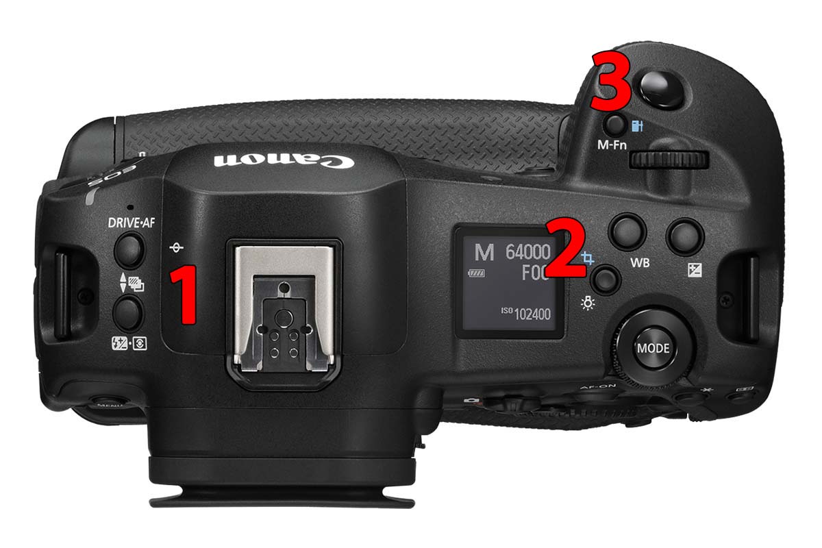 2 – A destra, e sempre rispetto alla R3, è stato aggiunto il pulsante dedicato al bilanciamento del bianco (WB). Il display secondario superiore è identico a quello della R3, e più compatto rispetto alle reflex, essendo a "doppia pagina" – la prima mostra l'essenziale: programma, tempo, diaframma, ISO e compensazione esposimetrica; la seconda, informa su modalità AD, Drive, bilanciamento del bianco, lettura esposimetrica e Picture Style. Continua a mancare il numero di scatti residui, per il quale si deve guardare il display posteriore. Per cambiare pagina bisogna premere il pulsante di retroilluminazione, mentre per attivare effettivamente la retroilluminazione, che in effetti è solo un'inversione colore testo/sfondo, il pulsante deve essere premuto a lungo. Si nota il simbolo del ritaglio, che porta a questa funzione quando ci si trova in modalità riproduzione.