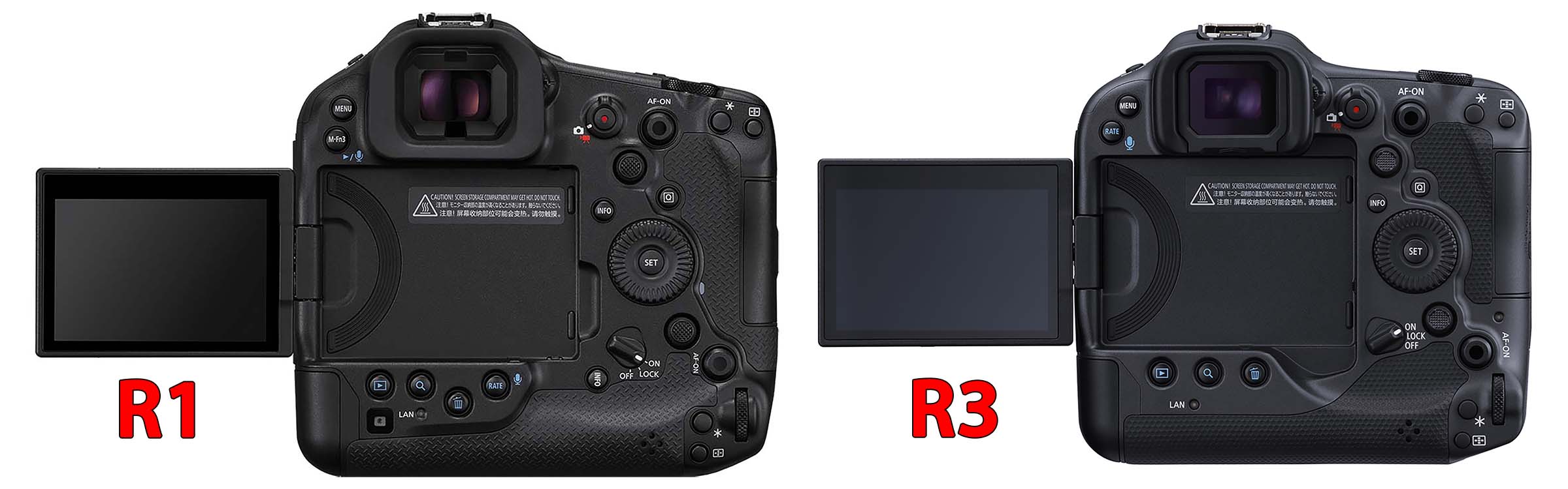 2 –Il display posteriore ha le stesse dimensioni ed è montato su un supporto articolato identico a quello della R3. Escludendo che possa trattarsi di un'ottimizzazione di costo, la ragione della sua minore risoluzione (2,1M di punti contro 4,15M) è probabilmente da ricercare nel minor consumo energetico e, quindi, nella maggiore autonomia garantita in modalità Live View.