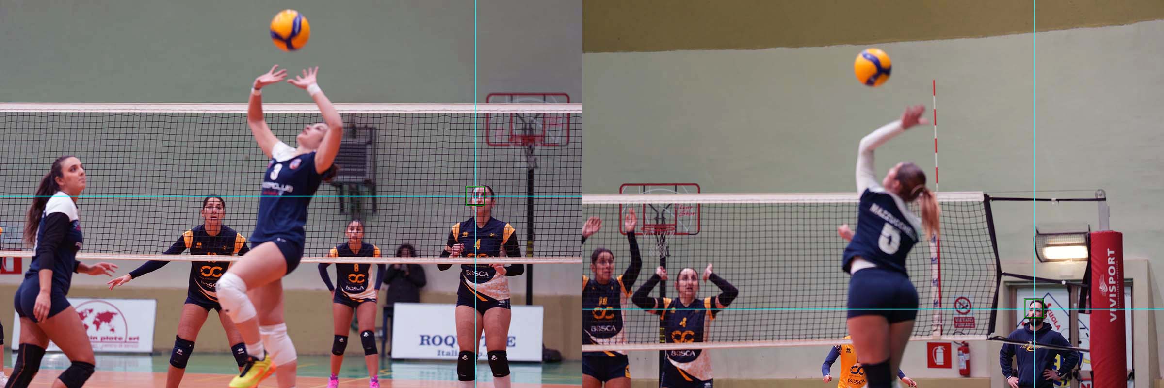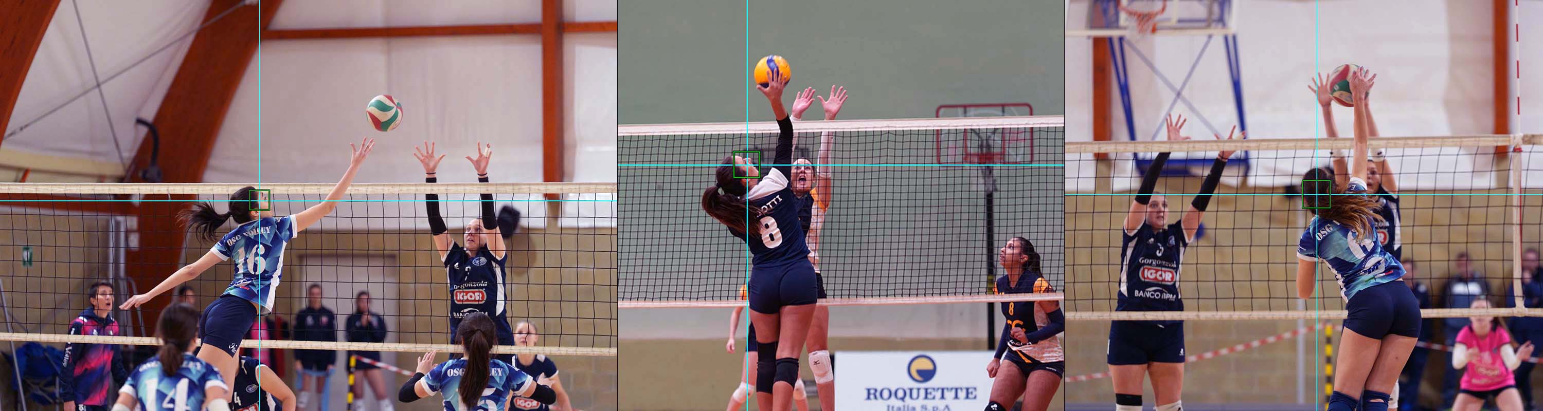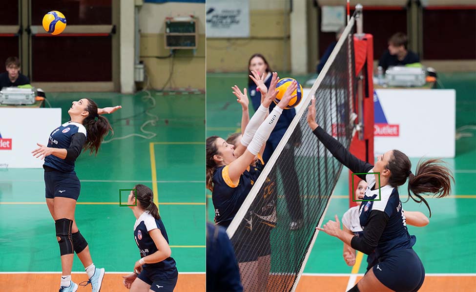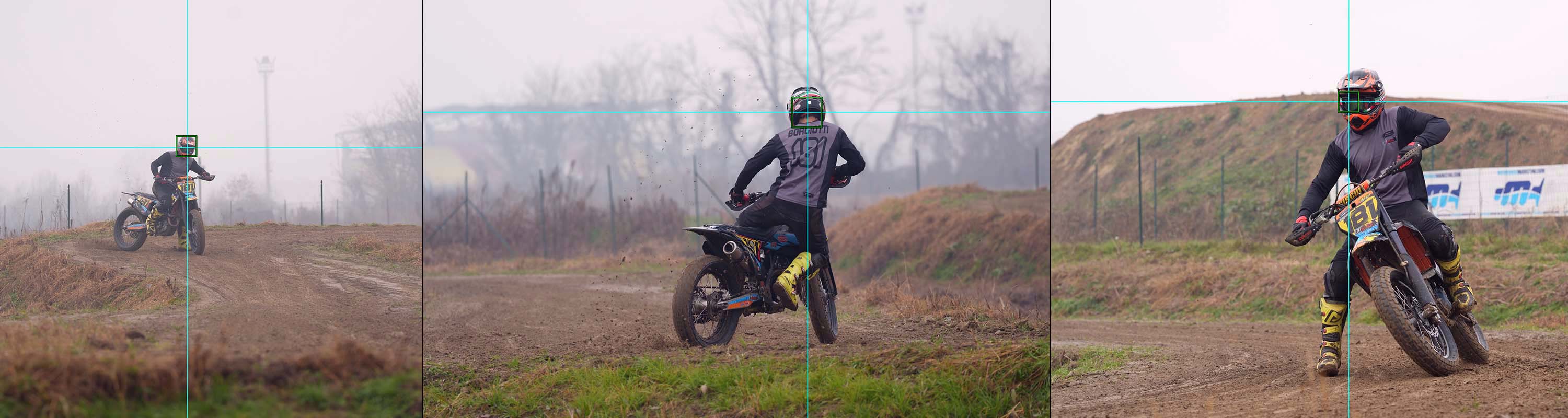 Qualche esempio di funzionamento corretto (e non banale) del sistema AF. In alto: Il volto (testa) viene individuato con sicurezza e precisione, anche quando l'atleta è quasi o completamente di spalle. Qui sopra: stesse valutazioni, anche in presenza di casco e quando il soggetto è molto lontano (primo fotogramma a sinistra).