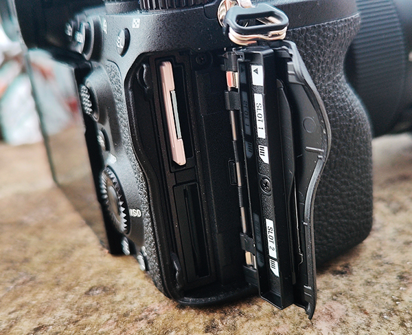 La nuova fotocamera Sony integra ora 2 porte USB di tipo C: una è super veloce, 3.2 gen2 10Gbps, l'altra è una 480Mbps. Per le schede si riprende lo schema di successo già visto, con doppio slot. Uno per schede SD, l'altro che può ospitare sia un'altra SD, sia una CF Type A.