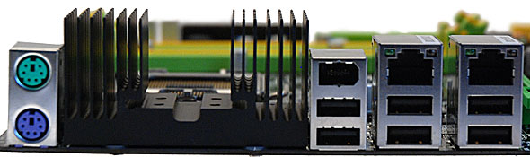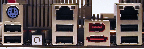 Nel pannello dei connettori posteriori della scheda madre troviamo due porte PS/2 per mouse e tastiera, 6 porte USB 2.0, 1 porta Firewire e due connettori Gigabit Ethernet. I connettori audio pilotati dal chip RealTek ALC885 a 7.1 canali sono invece collocati su un apposita scheda aggiuntiva, dove sono altresì presenti 2 connettori RCA S/PDIF.