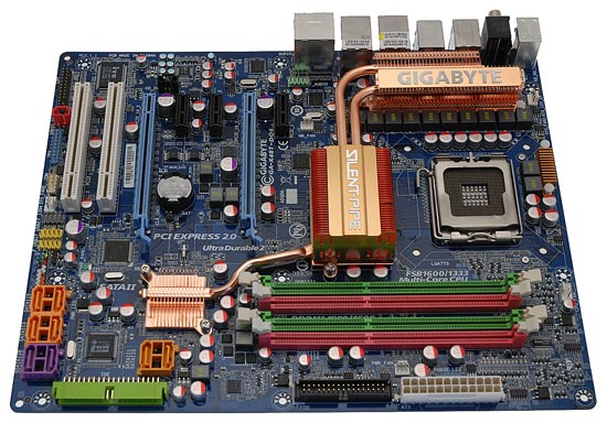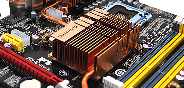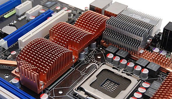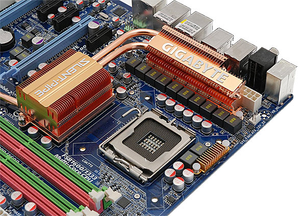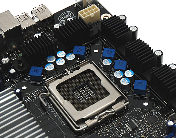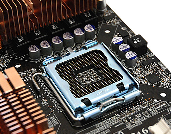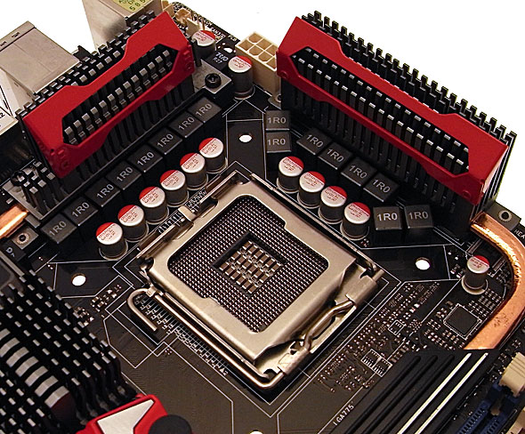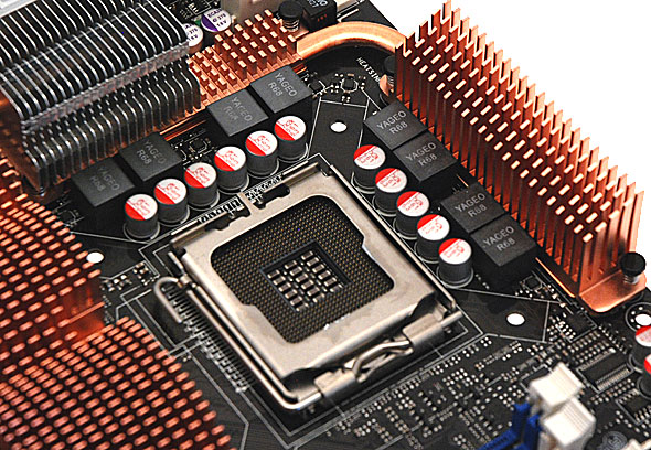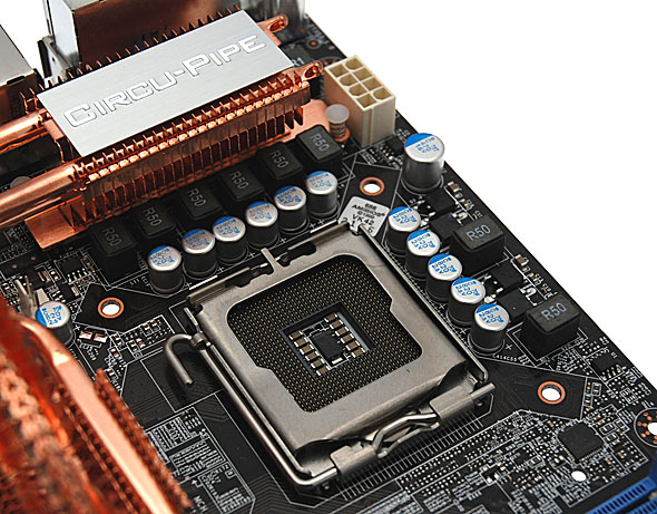 L'area attorno al Socket 775 LGA del processore si presenta essere sgombra da componenti che possano in qualche modo causare problemi nell'installazione del sistema di raffreddamento; si notino in particolare i condensatori di basso profilo tutti allo stato solido, accanto ai quali si trovano i 12 nuclei in ferrite a montaggio superficiale, capaci di trattenere al meglio l'energia rispetto a quelli tradizionali in ferro a frequenze elevate, conferendo quindi superiore stabilità del segnale in condizioni di carico elevato.