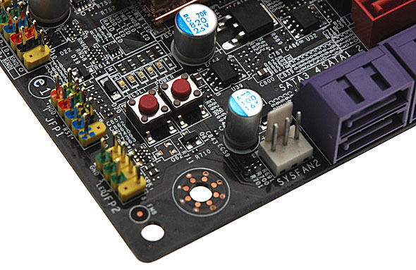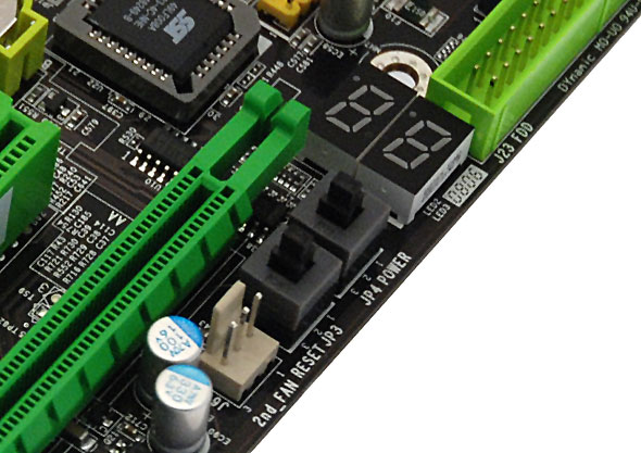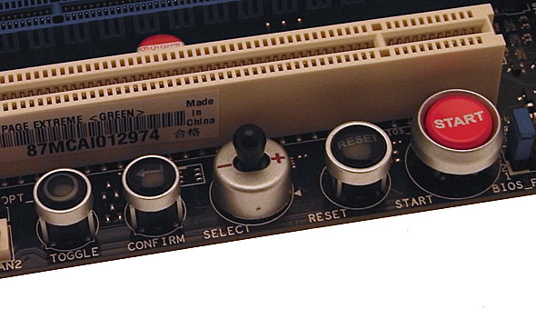 Non potevano infine mancare i pulsanti Power ON e Reset. Troviamo inoltre un display a LED che si occupa di comunicare all'utente i vari codici dei messaggi di POST durante la fase di boot del sistema. Interessante notare come ormai queste due tipologie di componenti, sebbene non siano indispensabili, sono ormai diventate un must per quasi tutte le schede madri di fascia alta.