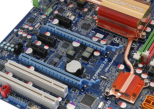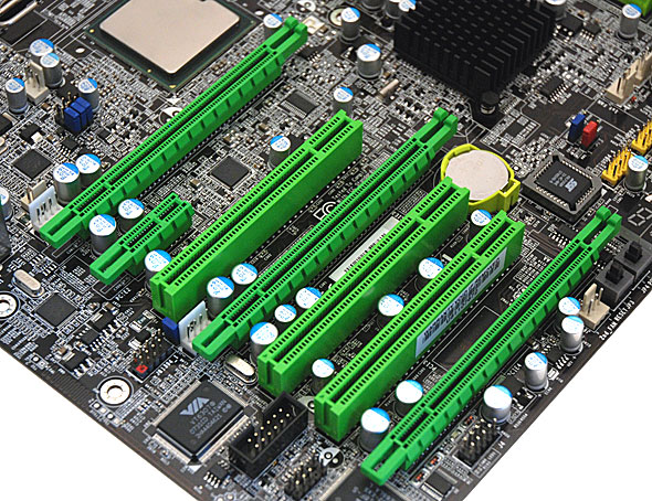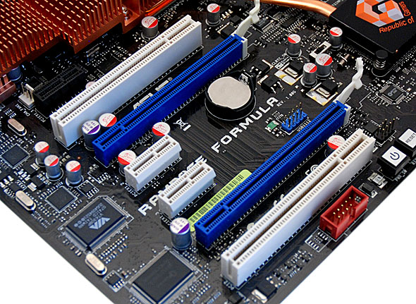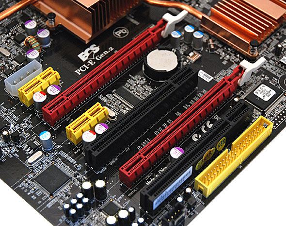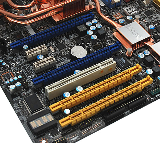 Se è apprezzabile la scelta di aver distanziato in modo evidente i due Slot PCI Express 16x, segnaliamo come così facendo sia venuta a mancare la possibilità di montare sul PCB della scheda madre 3 Slot PCI Express 16x, con i quali poter sfruttare configurazioni CrossfireX con 3 schede video in parallelo. Una configurazione di questo tipo non è supportata in modo nativo dal chipset X48 Express, ma sarebbe stata ottenibile utilizzando un chip bridge PCI Express che divida un segnale 16x in due 8x elettrici, destinati rispettivamente a due Slot PCI Express 16x meccanici. Oltre agli slot PCI Express 16x troviamo inoltre 3 slot PCI Express 1x e 2 slot PCI.