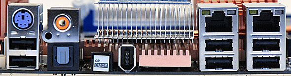 Nel pannello posteriore della scheda troviamo 1 porta PS/2 per la tastiera, 6 porte USB 2.0, 1 porta ottica, 1 uscita S/PDIF, 1 porta Firewire e due connettori Gigabit Ethernet controllati dai chip Realtek RTL8110SC su bus PCI e Marvell 88E8056 su bus PCI Express. Non poteva mancare, infine, un tasto per cancellazione della CMOS del BIOS.