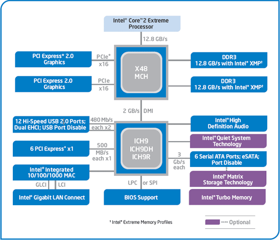Il precedente schema a blocchi illustra l'architettura a due chip utilizzata dalla piattaforma chipset Intel X48 Express: rispetto al modello X38, le differenze ravvisabili sono piuttosto marginali: il nuovo North Bridge X48MCH introduce il supporto alla frequenza di bus quad pumped di 1.600 MHz ed ha un memory controller integrato in grado di supportare come massimo moduli di memoria DDR3-1600. La piattaforma X48 Express integra inoltre il supporto alla tecnologia ATI Crossfire per configurazioni con due schede video operanti in parallelo: la configurazione degli Slot PCI Express prevede ben due slot 2.0 con 16 linee elettriche ciascuno.