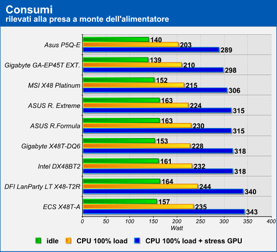 I test sui consumi hanno rilevato che le schede madri basate sul chipset X48 Express consumano mediamente di più delle schede madri con chipset Intel P45 Express: l'Asus P5Q-E e la Gigabyte GA-EP45T hanno fatto registrare dei consumi decisamente inferiori. Si denota inoltre una certa eterogeneità nei risultati fatti registrare dalle soluzioni X48, con variazioni da un modello all'altro che raggiungono in alcuni casi addirittura 36 Watt. Ma a consumi maggiori corrisponderanno prestazioni superiori? Lo scopriremo nel corso delle prossime pagine.