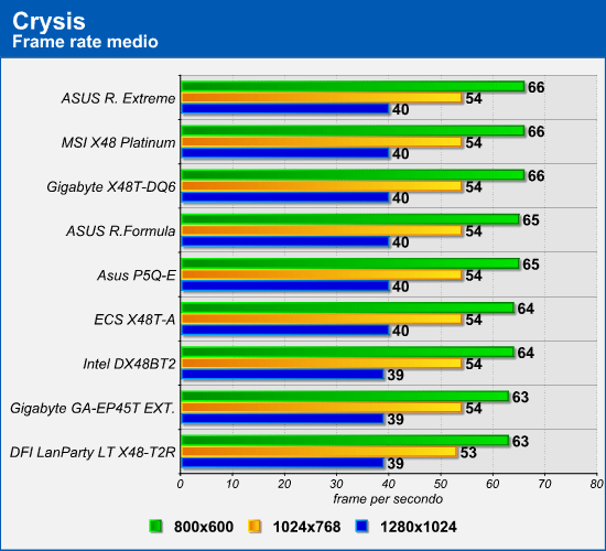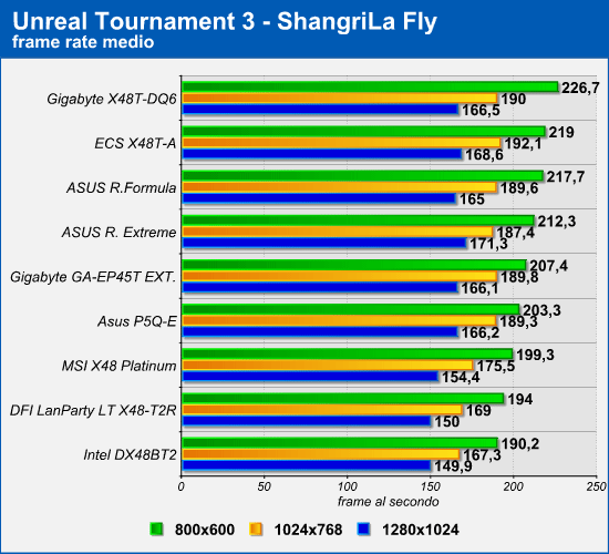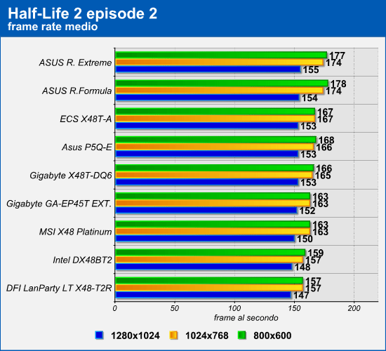 Se con Crysis le differenze prestazionali tra le varie schede madri sono pressoché nulle, con Unreal Tournament 3 e Half-Life 2: Episode 2 si inizia a notare qualche differenza. Il maggiore divario prestazionale rilevato nel corso di questi test è del 15-16% ed è stato fatto segnare in Unreal Tournament 3 dalle schede madri Gigabyte X48T-DQ6 e Intel DX48BT2, alla risoluzione 800x600.