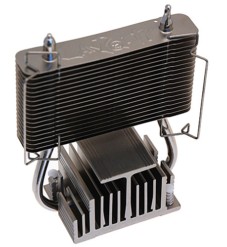 Il corpo del dissipatore in questione è fatto di alluminio, ad eccezione della base e delle due heat pipe, che sono invece realizzate in rame. Sono inoltre presenti dei ganci metallici per il fissaggio di un'eventuale ventola da 80 millimetri, che però non viene fornita in bundle con la scheda madre. Sebbene le dimensioni del sistema di raffreddamento del North Bridge garantiscano da un lato un'eccellente dissipazione del calore, va tuttavia detto che potrebbero anche dare qualche grattacapo a coloro che sono in possesso di dissipatori per CPU piuttosto voluminosi.