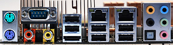 Nel pannello posteriore dei connettori troviamo due porte PS/2, una porta seriale a 9 pin, 6 porte USB 2.0, 1 porta eSATA, 2 connettori Gigabit Ethernet, i connettori audio Jack da 3.5 millimetri a 7.1 canali e 2 connettori ottici di tipo SPDIF per l'ingresso e l'uscita del segnale audio; non è presente invece nessuna porta Firewire.