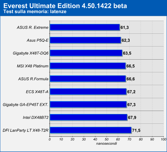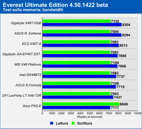 I test relativi alla memoria sono stati condotti eseguendo i benchmark presenti nell'ottimo tool Everest: abbiamo preso in esame i dati relativi alla velocità in lettura e in scrittura delle memorie, oltre che quelli della latenza delle stesse. I risultati andranno interpretati tenendo in considerazione i tipi di memoria utilizzati in abbinamento ad ogni scheda madre: Asus P5Q-E - Corsair Dominator DDR2 XMS2-10000, Gigabyte GA-EP45T Extreme - Corsair Dominator DDR3 XMS3-1800, Asus Rampage Formula - Corsair Dominator DDR2 XMS2-10000, Asus Rampage Extreme - OCZ 3P16002GK DDR3, Intel DX48BT2 - Corsair Dominator DDR3 XMS3-1800, Gigabyte X48T-DQ6 - OCZ 3P16002GK DDR3, DFI LanParty LT X48-T2R - Corsair Dominator DDR2 XMS2-10000, MSI X48 Platinum - OCZ 3P16002GK DDR3, ECS X48T-A - Corsair Dominator DDR3 XMS3-1800.