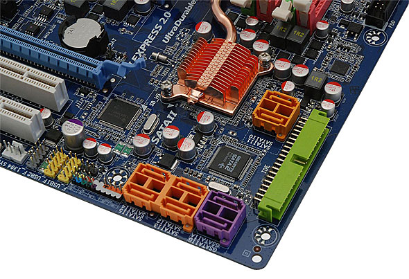 Gigabyte ha implementato in questa scheda madre ben 8 connettori per periferiche SATA II: 6, di colore arancione, sono collegati al south bridge del chipset Intel X48 Express e utilizzabili per creare configurazioni Raid 0, Raid 1, Raid 5 oppure Raid 10. I 2 restanti, di colore viola, sono collegati al chip Gigabyte SATA2, chiaramente identificabile dietro al connettore IDE di colore verde; questo controller permette di configurare catene Raid con 2 hard disk mettendo a disposizione le modalità Raid 0, Raid 1 e JBOD. Apprezzabile la presenza di chiare serigrafie che identificano i vari connettori e jumper presenti sulla scheda madre, oltre che la scelta di colori differenti per i jumper del case.