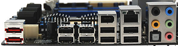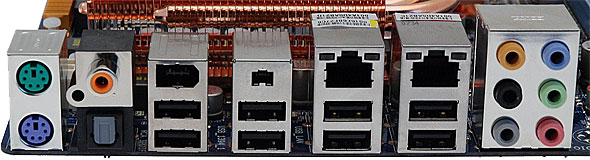 Come abbiamo già detto in apertura, nel pannello posteriore della scheda non troveremo alcuna porta PS/2 per mouse e tastiera. Saranno invece presenti 2 porte eSATA, 8 porte USB 2.0, 1 porta FireWire, 1 connettore Gigagibit Ethernet, un'uscita ottica S/PDIF e 5 connettori audio.