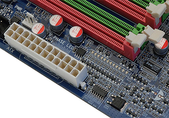 Osservando la foto precedente, si denota la presenza di un sistema di alimentazione per la CPU a 8 fasi, che permette di rendere il sistema più stabile fornendo tutta l'energia necessaria, anche in condizioni di overclock estremo. Tale sistema viene utilizzato, seppur con l'impiego di due sole fasi, anche per l'alimentazione delle memorie e del North Bridge.
