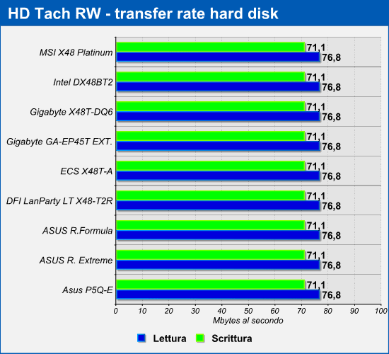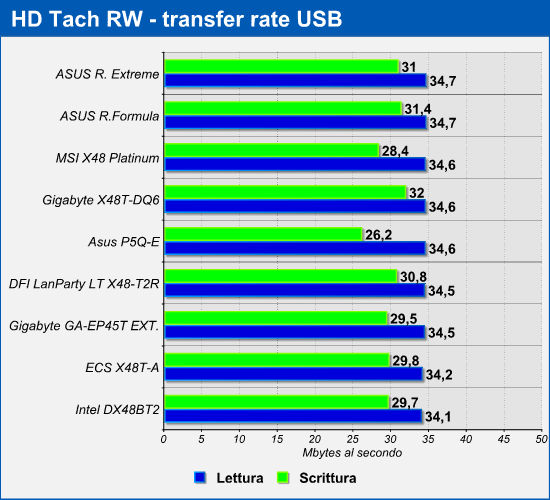 Di seguito i risultati dei test relativi al transfer rate medio in lettura e in scrittura dei dischi rigidi attraverso le interfacce Serial ATA e USB 2.0. I test sono stati condotti utilizzando il software HD Tach RW e i dati sotto riportati fanno riferimento alle velocità di trasferimento medie rilevate eseguendo operazioni di lettura e scrittura in modo sequenziale. Ricordiamo che per questo test abbiamo utilizzato rispettivamente un disco Western Digital WD7500AAKS-OORBA0 da 750GB collegato ad uno canali SATA, ed un Western Digital WD1600JS da 160GB montato in un box esterno e collegato ad una delle porte USB 2.0 presenti nel pannello posteriore delle schede madri.