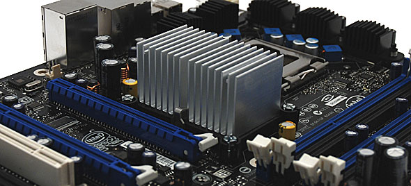 Il layout della scheda madre risulta estremamente pulito e non è dominato dalla presenza dei soliti colori troppo forti e sgargianti. Per il raffreddamento della circuiteria di alimentazione, del North Bridge e del South Bridge, Intel ha optato per dei dissipatori passivi di dimensioni discrete realizzati in alluminio.