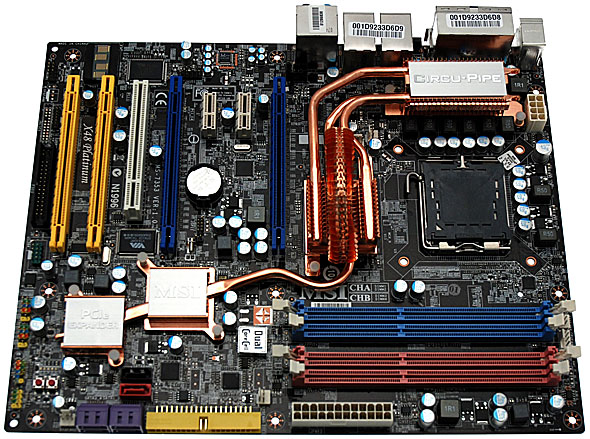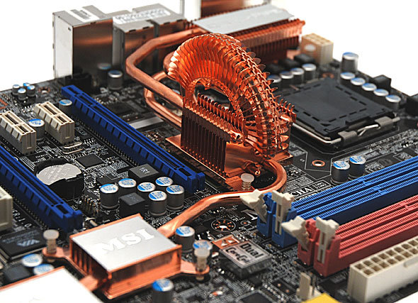 Osservando il layout di questa scheda madre, non si può non notare il voluminoso sistema di raffreddamento adottato da MSI. Come si evince facilmente dalla foto precedente, questo particolare sistema di raffreddamento è chiamato Circu-Pipe ed è costituito da efficienti dissipatori passivi in rame, collegati tra loro da alcune heat pipe e posizionati sopra la circuiteria di alimentazione, sul North Bridge e sul South Bridge.