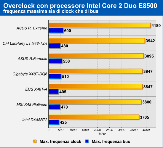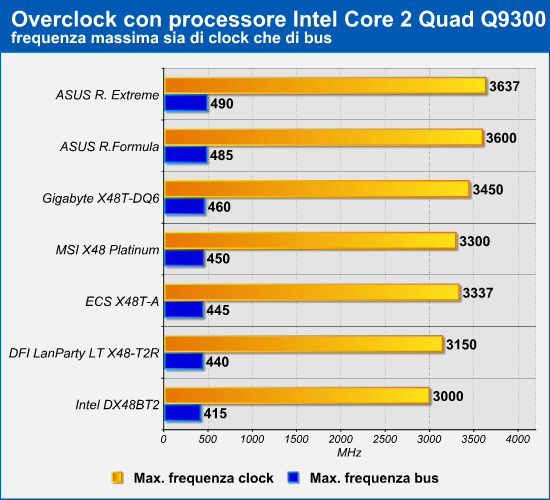 Con il processore quad core Intel Core 2 Quad QX9300 la frequenza di clock massima raggiunta è stata di 3,637GHz, ottenuta con la scheda Asus Rampage Extreme. Molto bene anche l'Asus Rampage Formula e la Gigabyte X48T-DQ6, che hanno raggiunto rispettivamente 3600MHz e 3450MHz. In coda troviamo l'Intel DX48BT2, che si è fermata alla soglia dei 3GHz, con un margine di overclock di 500MHz rispetto ai 2,5GHz originari. Segnaliamo che la scheda madre ECS X48T-A ha il moltiplicatore bloccato, di conseguenza i margini di overclock della frequenza di bus sono stati limitati ad un massimo di 445MHz.