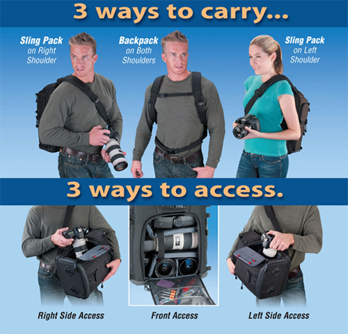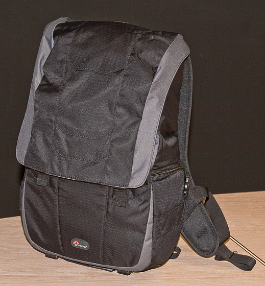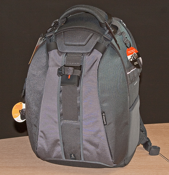 Basato sulla tecnologia costruttiva Vanguard che ingloba molta aria nei tessuti e negli elementi strutturali, nonostante la mole ha un peso a secco che le prime volte stupisce. Il vano principale, dotato dei classici elementi di separazione con bordi in velcro per la personalizzazione degli spazi, può ospitare una reflex con teleobiettivo ad ampia apertura montato e diversi altri obiettivi e accessori, come ad esempio flash. Il vano superiore ha sempre accesso dal retro dello zaino e può lasciare parte del suo spazio all'espansione di quello inferiore non essendoci soluzione di continuità (se non quella data dai separatori) e avendo una parte delle pareti ricoperta di velcro. Lo spazio a disposizione può ospitare molti altri oggetti, tra cui uno o due corpi macchina, obiettivi e flash. La cerniera nella parte frontale dona invece accesso a un'ampia tasca, alta come tutto lo zaino, all'interno della quale riporre documenti e oggetti vari. La tasca viene proposta riempita da una custodia imbottita per laptop fino a 15,6" che vi trova comodamente spazio. Le cerniere di questa tasca e del vano superiore, poste sui bordi ed eventualmente soggette a stress meccanici, sono protette da questi ultimi grazie a fibbie collegate a cinghie, aiutano a sopportare i carichi. Lo schienale e gli spallacci utilizzano la stessa tecnologia costruttiva con aria inglobata, sono molto morbidi e soprattutto offrono una ampia gamma di regolazioni per essere adattati al meglio alle esigenze di diverse corporature. Anche la fascia lombare è molto imbottita e regolabile in altezza. Il prezzo consigliato al pubblico di € 329,00 rende questa proposta adatta a un pubblico esigente. Lo zaino meno 'strutturato' di quelli che abbiamo provato è Versapack 200 AW di Lowepro, che si presenta come una borsa leggera, in stile 'urban', a due spallacci, utile per trasportare una reflex con ottica montata, due obiettivi e qualche accessorio, ad esempio un flash, nel vano inferiore (dotato di separatori in velcro) e altro materiale in quello superiore. L'accesso alla macchina fotografica richiede lo sgancio delle fibbie e l'apertura di una cerniera, non è quindi previsto un accesso rapido.