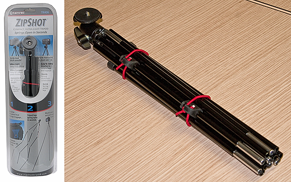Zip Shot prova a rivoluzionare il settore utilizzando un sistema simile a quello utilizzato per i sostegni delle tende da campeggio, impiegando tubolari d'alluminio uniti da forti elastici. Sganciando i due elastici di fermo e scuotendo il treppiedi tenendolo per la testa, in pochi secondi le gambe si 'montano', portando in posizione corretta tutti gli elementi. Il cavalletto ha pregi e difetti: è leggero, pesa solo 312 grammi, è compatto, ma comodo (chiuso occupa 38cm e aperto ha un'altezza di 112cm), si monta smonta in pochi secondo.
