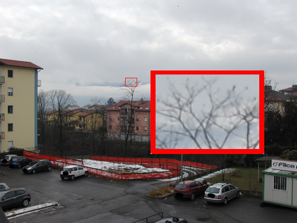 Dallo stesso punto di ripresa e mantenendo le stesse impostazioni si è scattata una ulteriore immagine del campanile alla focale tele di 432 mm.