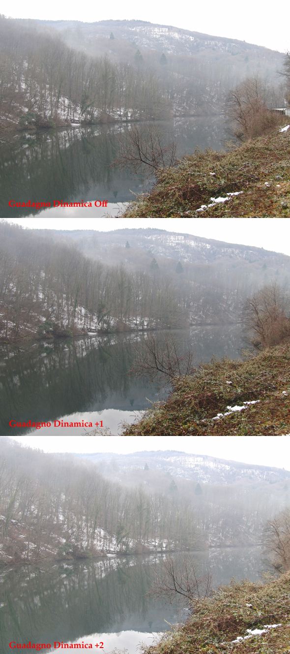 Gli ultimi valori a 1600 ISO riportano le diciture G1 e G2 con le quali abbiamo indicato il guadagno di gamma dinamica attivato. G1 è il primo step di guadagno di gamma dinamica, mentre G2 è il secondo; nella immagine seguente sono raccolti tre scatti della stessa inquadratura eseguiti con identici valori di sensibilità, tempi di otturazione e diaframma. E' stato modificato unicamente il valore di guadagno dinamico: nullo, G1, G2.