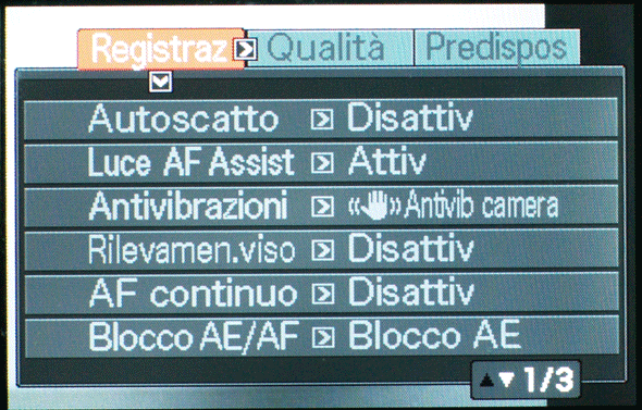 Casio Exilim F1 è alimentata da una batteria dedicata agli ioni di litio; se l'autonomia nell'utilizzo foto consente di eseguire circa 580 scatti, in modalità video le ore di girato si attestano intorno alle 3,5. Oltre ad una memoria interna da poco più di 30 MB, lo slot di memoria ospita schede SD/SDHC oppure Multimedia Card/Plus. A lato del flash integrato sono posizionati due microfoni, uno per lato, la fotocamera è fornita di paraluce. Pagina 3 - Corpo e Comandi 2 Le funzionalità offerte dalla Exilim F1 sono molte, il menù è organizzato in tre schede principali: Registrazione, Qualità, Predisposizioni. All'interno di ogni scheda le diverse voci si aprono in menù a tendina che consentono la selezione desiderata.