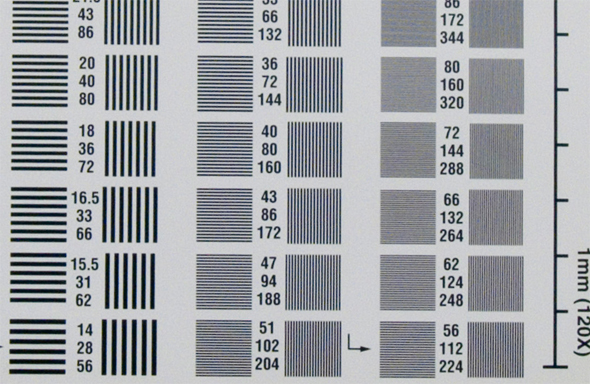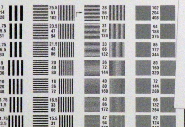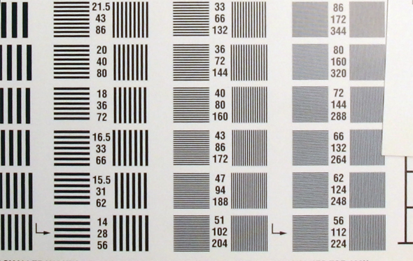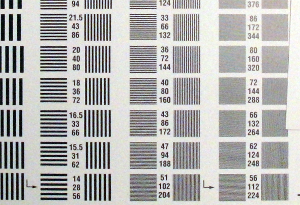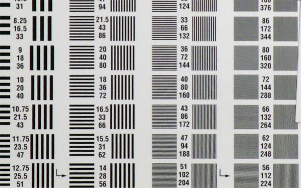 Si ottiene la performance peggiore con 80 lp/mm equivalenti a 851 LW/PH e la comparsa di moirè. Riassumiamo in tabella le risoluzioni misurate:
