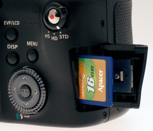 La disposizione dei comandi è divisa tra il dorso e la spalla: sul dorso prende posto il display lcd TFT da 236.160 pixel, a lato il dial di selezione provvisto di una ghiera concentrica. Appena sopra i tasti di accesso al menù, conversione di visuale tra monitor e mirino ed il tasto DISP alla cui pressione corrisponde la comparsa a schermo dei dati riguardanti la foto. Il pulsante di revisione degli scatti/video è riportato a lato del mirino ed è contraddistinto da una freccia verde di play per la revisione e di un tasto rosso che ripristina lo stato di lavoro della fotocamera. Sullo spigolo in alto a destra del dorso è riportato il controller di attivazione video. Si compone di un tasto centrale che inizia e ferma la registrazione e di un selettore a tre posizioni che consente di scegliere tra ripresa standard, HD e HS.