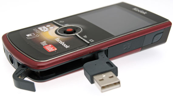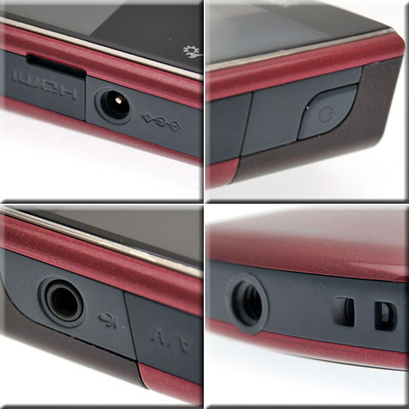 Il lato sinistro offre una delle caratteristiche più interessanti della videocamera: il connettore jack audio per microfono esterno in formato 3,5mm. Sotto quest'ultimo troviamo poi il connettore HDMI e quello di alimentazione. Il lato superiore vede la sola presenza del comando a slitta per la commutazione del fuoco fisso da macro a infinito. Il lato destro integra il pulsante di accensione, lo slot SDHC (ricoperto da uno sportello in gomma) e il connettore USB, utile pee la connessione diretta al PC, frangente durante il quale viene ricaricata anche la batteria integrata.