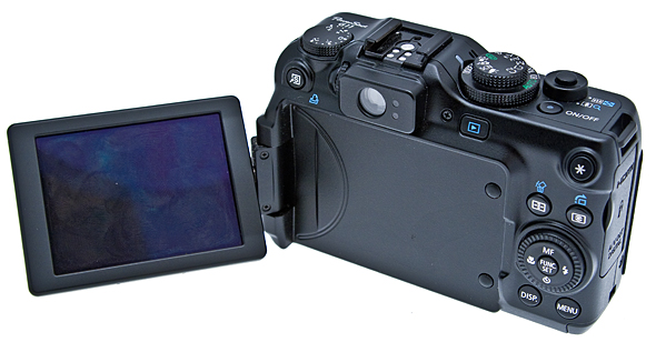 Il posteriore si inserisce nella tradizione delle compatte, ma vede la presenza di un numero davvero elevaqto di pulsanti e un display snodato da 2,8" pollici di diagonale e risoluzione pari a 461.000 punti. Sulla destra oltre alla ghiera di regolazione che fa da contorno al joypad a 5 vie troviamo i pulsanti di accesso al menu, di gestione del display, di gestione dei punti autofocus e della modalità di lettura esposimetrica, utilizzato anche per la commutazione in modalità manuale tra la regolazione di tempi e diaframmi.