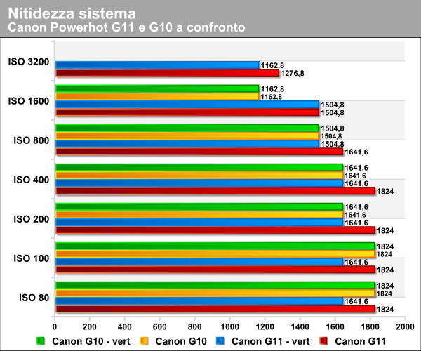 Il valore di 800 ISO vede scendere le macchine di un gradino di risoluzione, mentre 1600 ISO rappresentano il vero spartiacque tra le due fotocamere, con la G10 che perde diverse posizioni attestandosi su un valore di risoluzione pari a 1163 LW/PH, con la Canon G11 stabile invece nelle due direzioni a 1505 LW/PH. Il calo drastico della risoluzione avviene per la G11 a 3200 ISO, mantenendo comunque il dato orizzontale superiore ai 1600 ISO della G10 con 1277 LW/PH e quello verticale pari, con 1163 LW/PH. Pagina 6 - Canon Powershot G11 e G10 a confronto - parte seconda