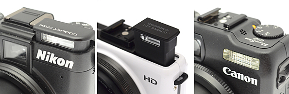 Le tre macchine mettono inoltre a disposizione un flash integrato, fisso su Canon G12 e a pop-up sulle proposte Nikon e Olympus. La presenza di un maggior numero di tasti sulle top di gamma Nikon e Canon ha permesso l'integrazione di comandi tipici del mondo reflex, ad esempio il blocco dell'esposizione (assente nella proposizione Olympus), oltre che di tasti dalle funzioni personalizzabili.