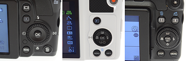 D'altra parte le due premium Canon e Nikon offrono una ghiera appositamente dedicata alla compensazione dell'esposizione, operazione che invece sulla Olympus chiede di intervenire su uno dei tasti del joypad (quello in direzione verso l'alto) e poi di agire sulla ghiera di regolazione ad esso concentrica.